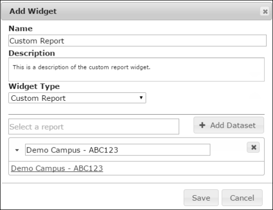 All reports in your organization or its descendants appear in the box. Parent organization filters appear for subgroup as well. In a widget you can select reports that are public or the reports that you have authored.